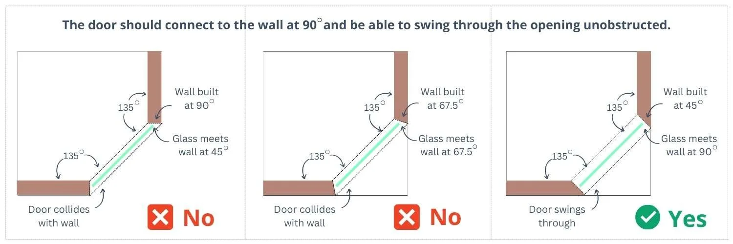 2. When connecting glass to a framed wall or pony wall, build the walls at whatever angle is needed for the glass to connect to the wall at 90°, and allow doors to swing through unobstructed.