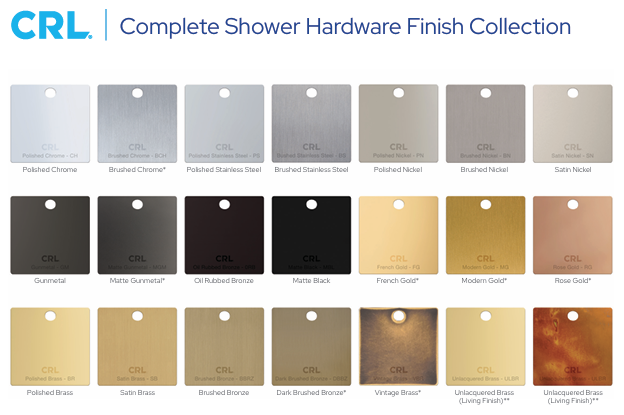 Many other hardware parts and finishes are readily available from the manufacturer. Once a particular hardware and finish is determined for your shower design, we can identify any availability or lead-time issues and find alternatives if needed.